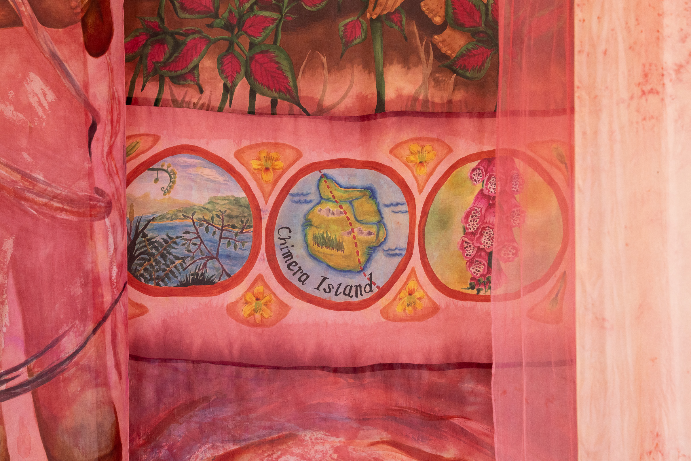 Chimera Island is an immersive new installation at the Loughborough based gallery Modern Painters, New Decorators. The exhibition reimagines landscapes as sites of resistance, refuge, and radical re-connection for Black, brown and Global Majority communities. Working across textiles, animation, sound, and natural dyeing, Chimera Island explores how colonial histories haunt rural spaces — and how those same spaces might be reimagined through a speculative, restorative lens.