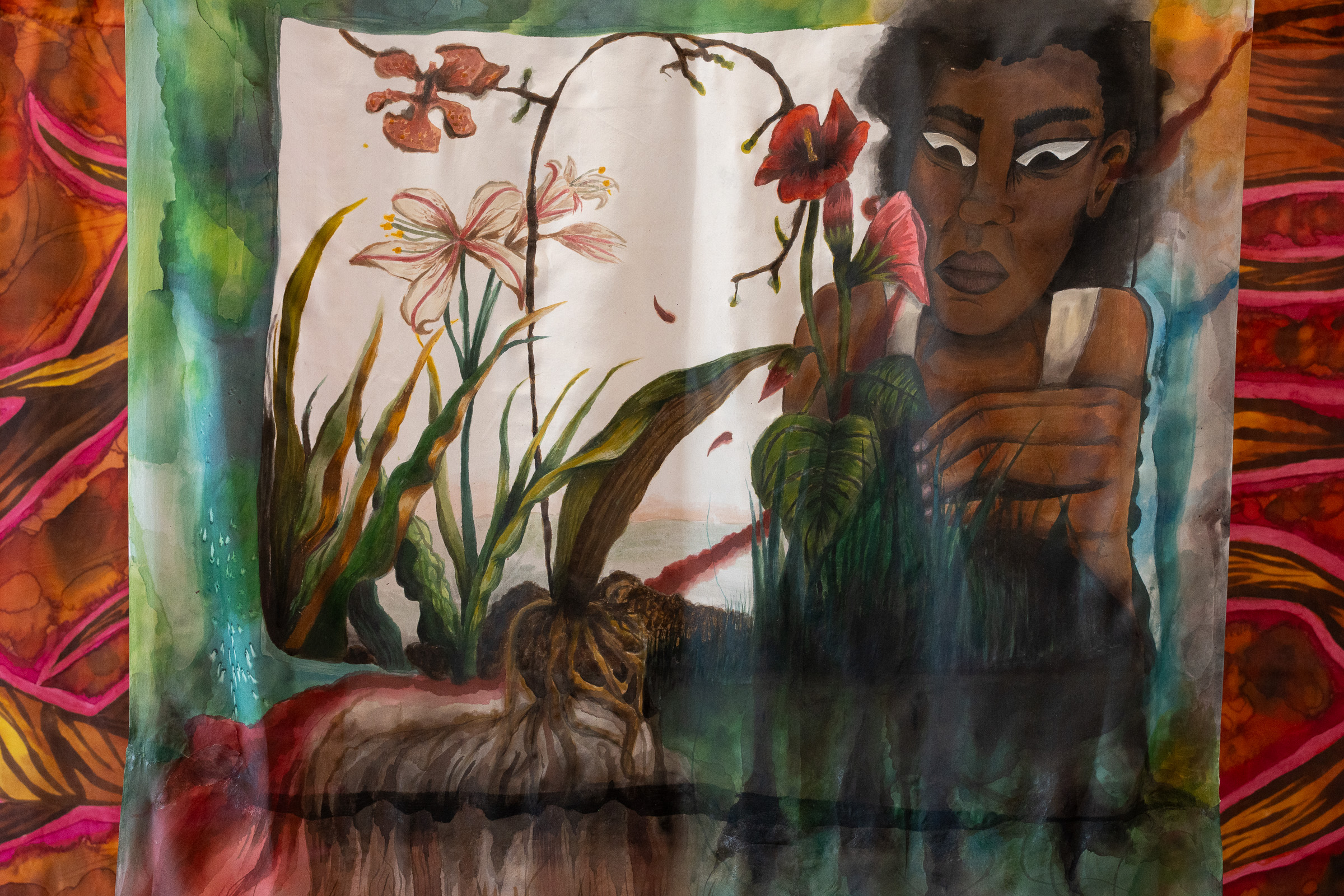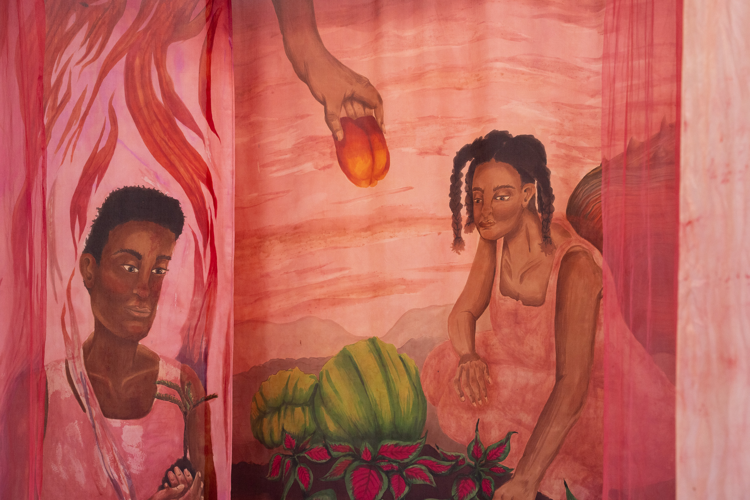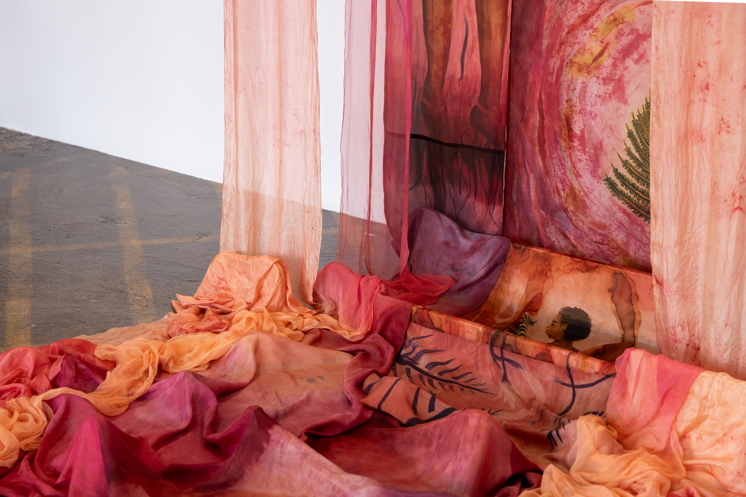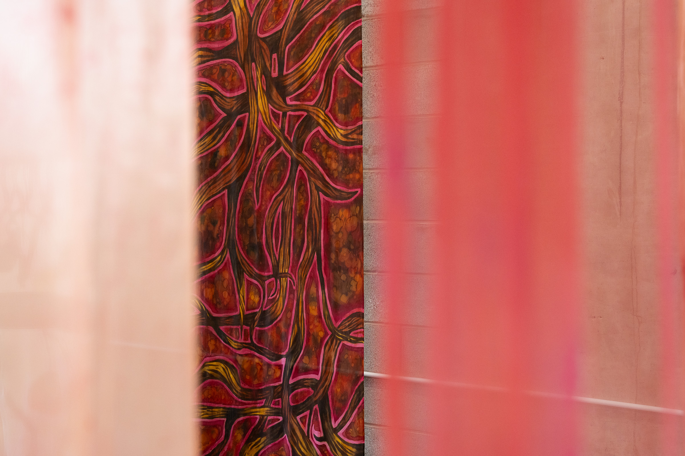 At the heart of the exhibition is a new large-scale textile installation in vivid pinks and magentas, dyed using Brazilwood and Logwood — a material historically linked to colonial extraction and trade. The works unfold like exploded storyboards: layered scenes and characters suspended in space, weaving together silk painting, sound, and hand-drawn animation; a visual meditation on identity, resistance, and the possibility of reimagining place.