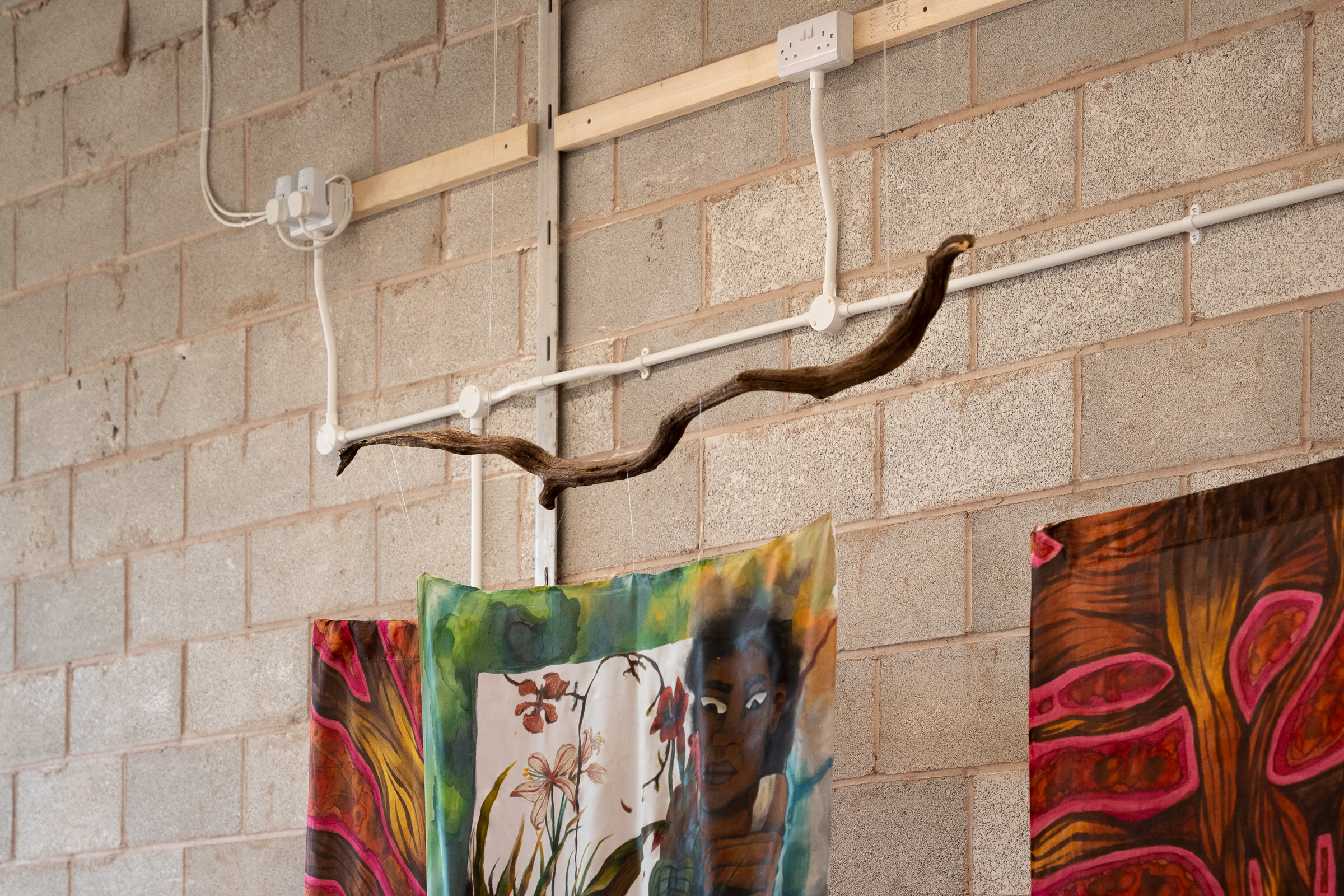 (Front panel) ‘when you rip the people from the earth, you also rip the earth from the people’ (2024) - Silk paint and acrylic ink on Habatoi silk and wooden branch.
